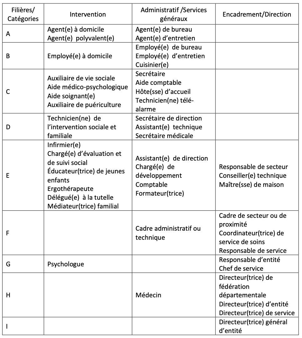 La convention collective ADMR classifie les travailleurs selon trois filières d’emplois. On distingue : les personnels d’intervention ; les personnels d’encadrement et de direction; et les personnels administratifs et de services généraux.